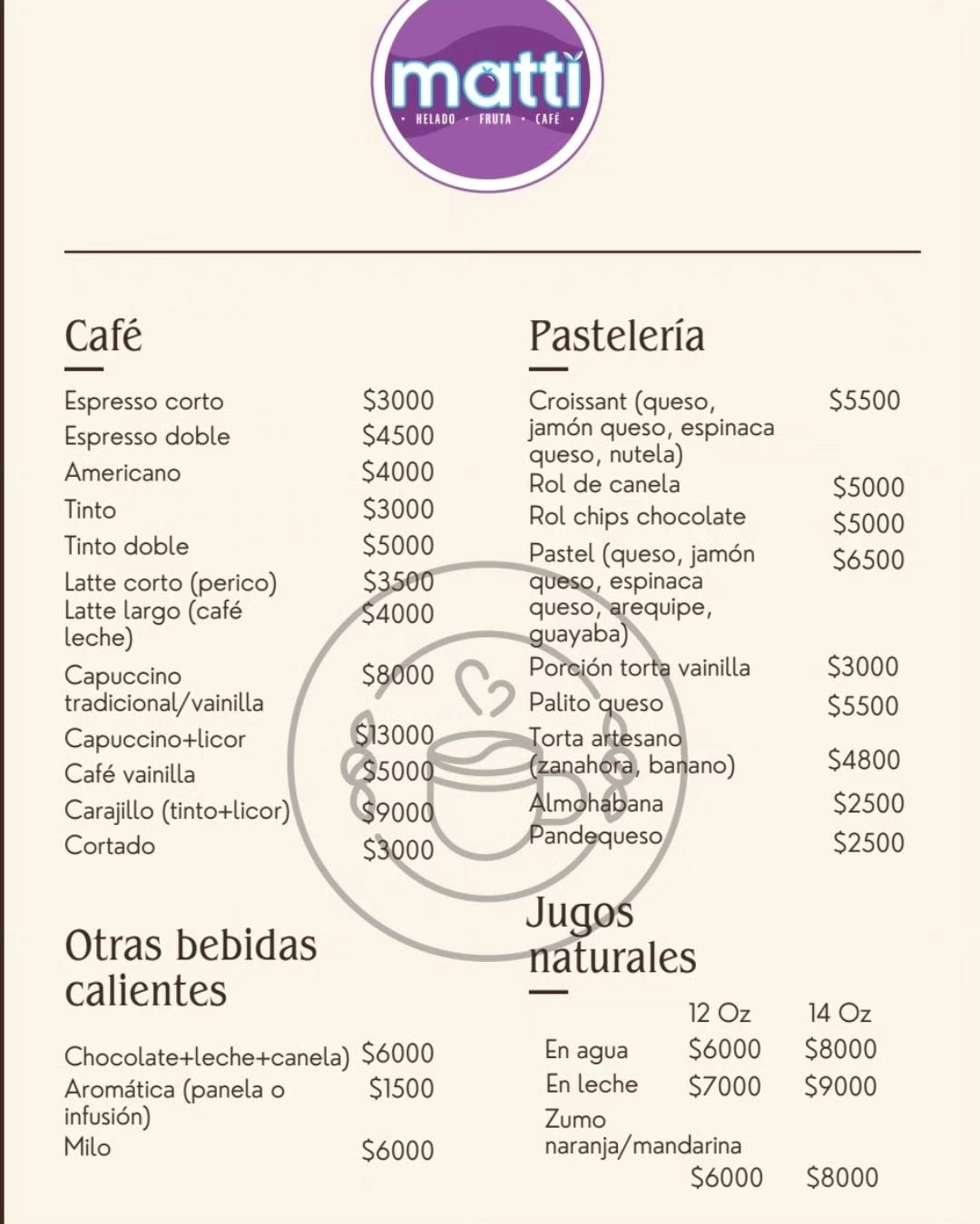 Porque en Matti no solo vendemos café o helados: ofrecemos momentos. Cada taza, cada jugo, cada postre está preparado con dedicación y con ingredientes frescos y deliciosos para que disfrutes de calidad y sabor en cada visita.
